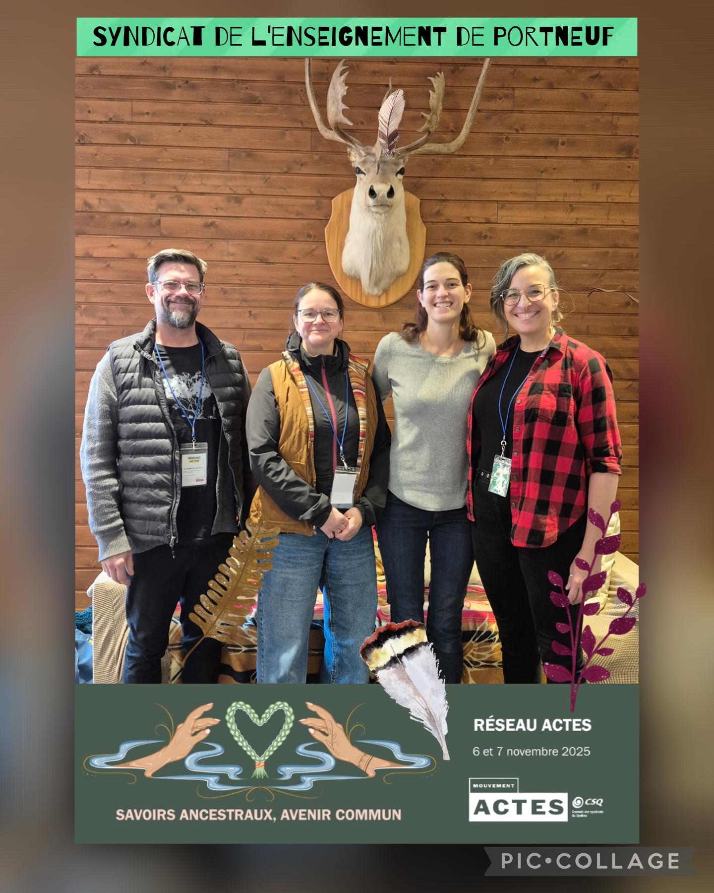 Le dernier Réseau ACTES a eu lieu les 6 et 7 novembre 2025, à Wendake, sur le thème Savoirs ancestraux, avenir commun. Ce fut un réseau unique, une expérience immersive qui a permis à 4 enseignants de Portneuf (Daniel Blanchet, Geneviève Moisan, Mélanie Gosselin et Marie-Ève Barbe) de mieux comprendre la vision du monde portée par différentes nations autochtones et par le peuple inuit. Organisé en collaboration avec l’organisme Les voix du territoire, cet événement a permis de découvrir comment il est possible d’assurer une meilleure sécurisation culturelle des élèves, de la population étudiante et des bénéficiaires autochtones. De plus, ce Réseau a aidé à comprendre comment la vision du monde portée par les autochtones ainsi que leurs savoirs ancestraux nous permettent de mieux faire face aux défis contemporains, comme la crise écologique.