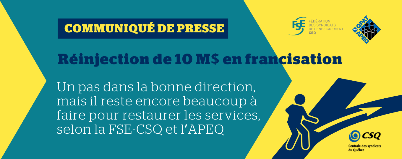 • Réinjection de 10 M$ en francisation – Un pas dans la bonne direction, mais il reste encore beaucoup à faire pour restaurer les services, selon la FSE-CSQ et l’APEQ